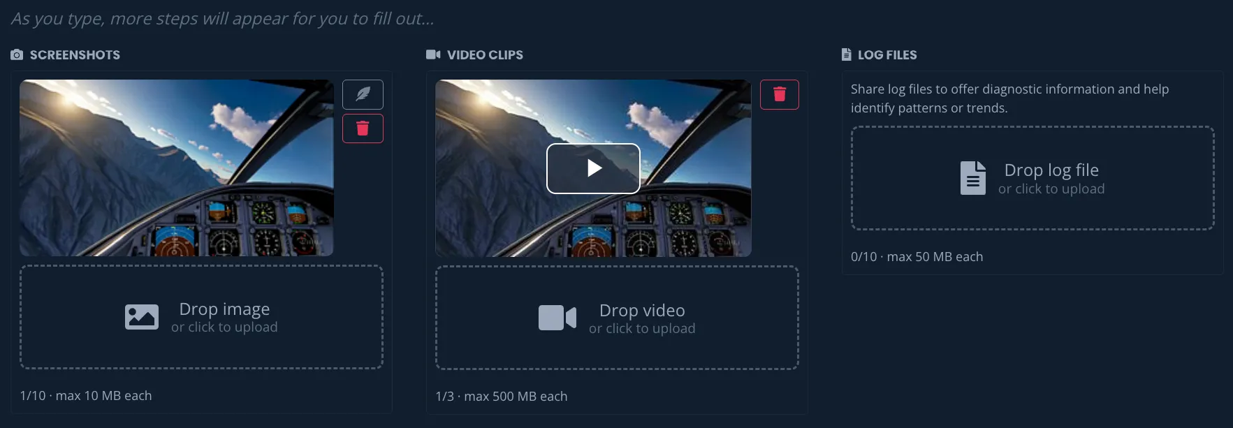 Files can now be dragged directly onto the issue edit page. Drop images, videos, or log files — they upload immediately with a progress indicator.